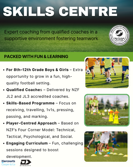 Led by NZF-qualified academy coaches, the programme employs a balanced approach that covers the four key areas of player development: Technical, Tactical, Psychological, and Social. This means your player gets the best chance to improve while enjoying every session.