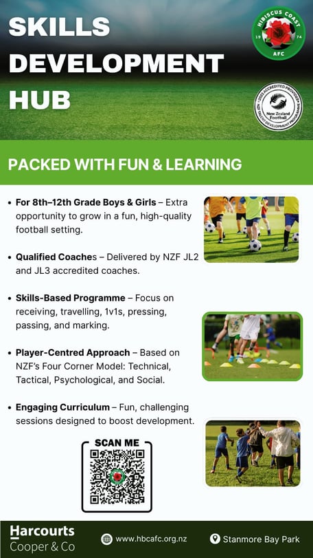 Led by NZF-qualified academy coaches, the programme employs a balanced approach that covers the four key areas of player development: Technical, Tactical, Psychological, and Social. This means your player gets the best chance to improve while enjoying every session.